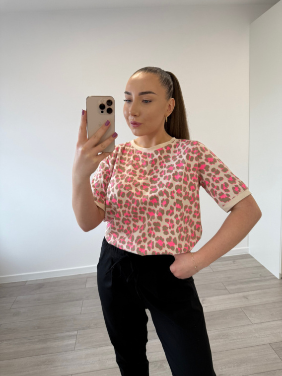 Bluzka w brązowo różową panterkę , z beżowymi wstawkami.