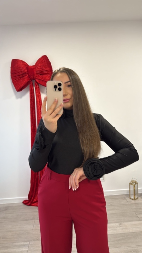 Elegancka czarna bluzka, która zachwyca subtelnymi, dekoracyjnymi detalami i ponadczasowym fasonem. Model z delikatnym golfem został ozdobiony trzema materiałowymi różami, które nadają całości wyjątkowo kobiecego i szykownego charakteru. Dodatkowym akcentem są dwie ozdobne róże umieszczone na rękawach, przyciągające uwagę i podkreślające oryginalny styl bluzki.