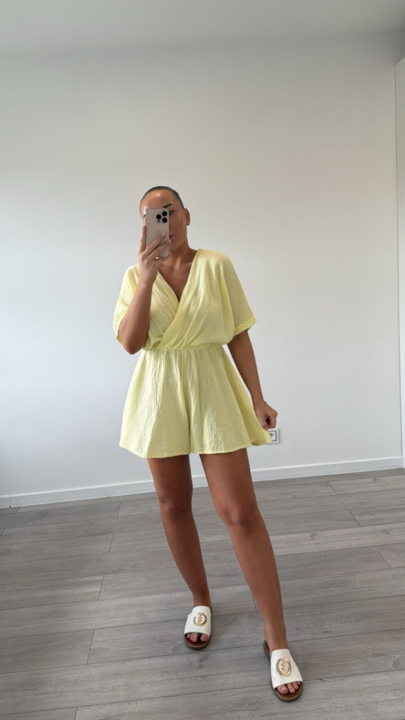 Kombinezon muślinowy to zdecydowany hit tego sezonu! . Posiada gumkę w talii, kopertowy dekolt, kimonowe rękawy. Wykonany z 100% bawełny, materiał jest miękki, przewiewny, świetnie się nosi. Występuje w rozmiarze uniwersalnym