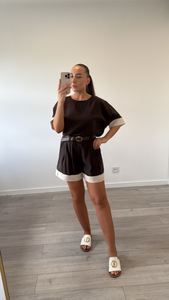 Komplet - bluzka i szorty Stylowy komplet na lato w odcieniu głębokiego brązu z kontrastowymi kremowymi wykończeniami. Luźna bluzka z krótkim rękawem i szorty z wysokim stanem oraz paskiem podkreślającym talię. Wykonany z lekkiego, przewiewnego materiału - idealny na ciepłe dni.