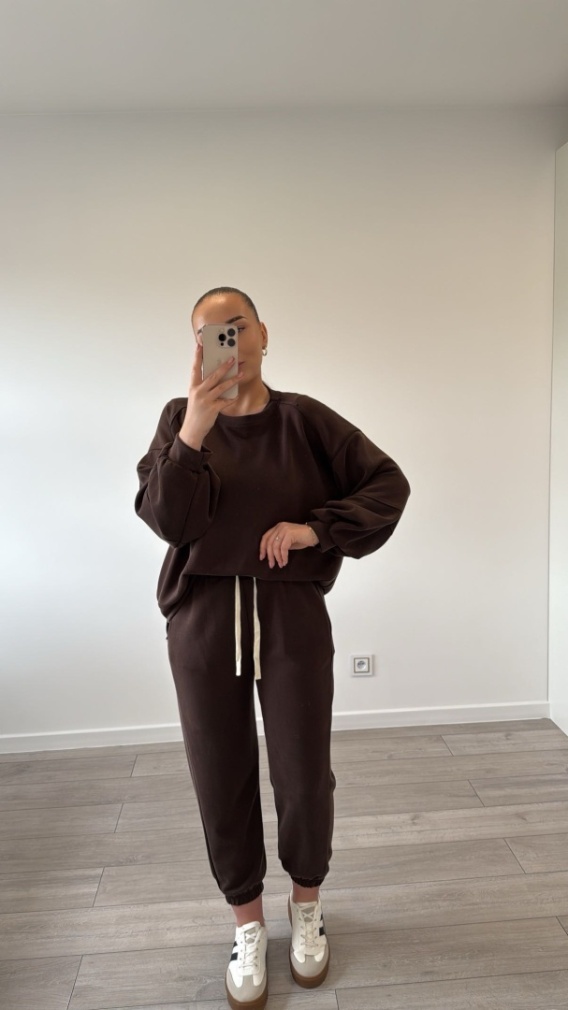 Ten komplet to czysta definicja komfortu. Uszyty z materiału miękkiego jak masełko, otula ciało i daje uczucie przyjemnego relaksu już od pierwszego założenia. Głęboki, czekoladowy odcień sprawia, że wyglądasz stylowo nawet w totalnym chill mode.