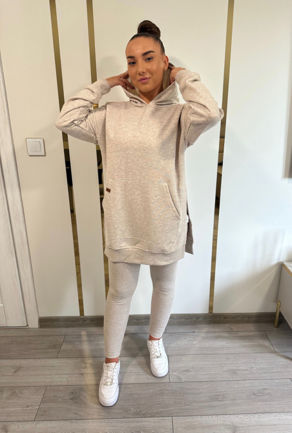 Komplet Dresowy Venice Szary to idealna propozycja dla wszystkich miłośników wygody i stylu. Składający się z długiej bluzy z rozcięciem po bokach oraz dopasowanych leginsów prążkowanych, ten zestaw zapewni Ci nie tylko komfort noszenia, ale także modny wygląd. Bluza posiada kaptur, który dodaje jej sportowego charakteru i chroni przed chłodem podczas chłodniejszych dni. Rozcięcia po bokach nadają jej oryginalności i lekkości, sprawiając że będzie ona doskonałą opcją zarówno na co dzień, jak i do aktywnego wypoczynku. Legginsy prążkowane są nie tylko bardzo wygodne dzięki swojemu elastycznemu materiałowi, ale również dodadzą Twojej stylizacji nutki nowoczesności i streetwearowego look'u. Doskonale dopasowują się do sylwetki, podkreślając atuty figury. Kolor szary jest ponadczasowy i łatwy do łączenia z innymi elementami garderoby - możesz stworzyć wiele różnorodnych outfitów bazujących na tym zestawie. Idealnie sprawdzi się zarówno jako strój domowy do lenistwa przed telewizorem czy książką, jak i jako casualowa opcja na spotkanie ze znajomymi czy krótkie zakupy. Zamów już dziś Komplet Dresowy Venice Szary i ciesz się swobodą ruchów oraz modnym wyglądem!