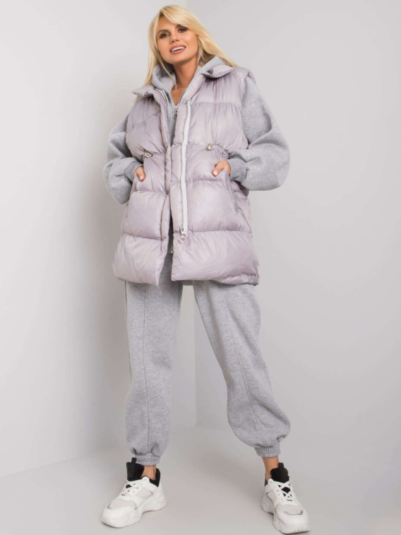 Szary , trzyczęściowy komplet Abigail, składający się z rozpinanej bluzy z kapturem, dresowych spodni i puchowej kamizelki, zapewni Ci nowoczesny i elegancki wygląd. Przyjemny w dotyku materiał w składzie 70% bawełna i 30% poliester na górę oraz 100% poliesterowe ocieplenie na kamizelce sprawi, że nie będziesz czuć chłodu. Uzupełnieniem są kieszenie, podszewka i wygodny krój.