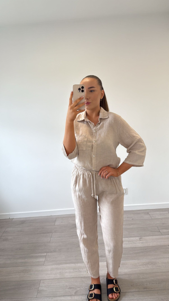 Komplet składający się z koszuli oraz spodni. Koszula ma kieszonkę na wysokości biustu rękaw o długości 3/4. Spodnie mają wszytą gumkę oraz posiadają kieszenie.