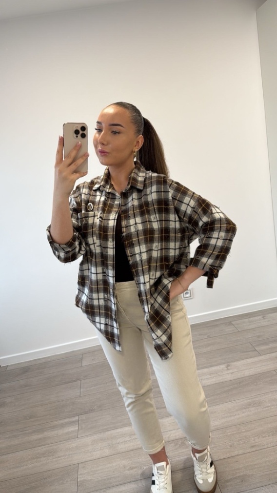 Ponadczasowa koszula w kratę w odcieniach brązu, czerni i bieli to idealna baza do codziennych stylizacji. Wykonana z miękkiego, przyjemnego materiału, świetnie sprawdza się jako klasyczna koszula lub narzutka na top czy T-shirt.