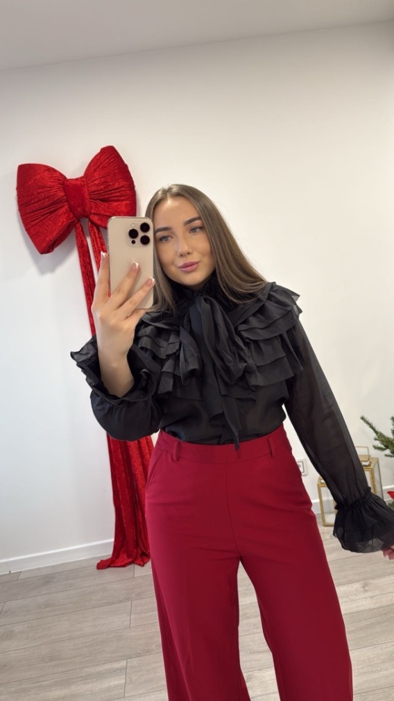 Wyróżnij się klasą i niepowtarzalnym stylem dzięki tej eleganckiej koszuli w głębokim, czekoladowym odcieniu. Model zachwyca subtelną przejrzystością materiału oraz wyjątkowymi detalami, które nadają mu luksusowego charakteru. Duża, wiązana pod szyją kokarda dodaje kobiecej finezji, a kaskadowe, delikatne falbany na biuście tworzą efektowną, przestrzenną linię.