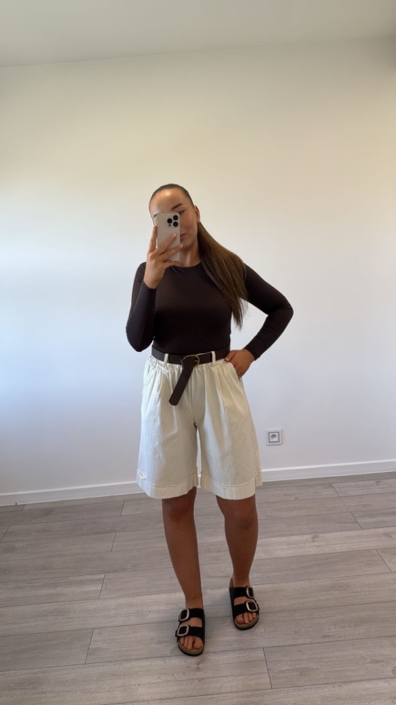 bermudy z wysokim stanem, zaprojektowane z myślą o nowoczesnej kobiecie ceniącej wygodę i styl. Wykonane z przyjemnego w dotyku, oddychającego materiału, świetnie trzymają fason i pięknie układają się na sylwetce.