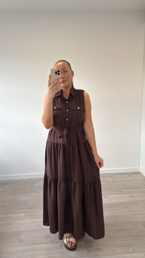 Sukienka, która łączy elegancję koszulowego fasonu z lekkością letnich stylizacji. Góra z kołnierzykiem i guzikami nadaje jej struktury, a kieszenie na piersiach dodają funkcjonalnego charakteru. Przewiewny materiał i bezrękawowy krój zapewniają komfort nawet w najcieplejsze dni, a wiązanie w talii pięknie podkreśla sylwetkę.
