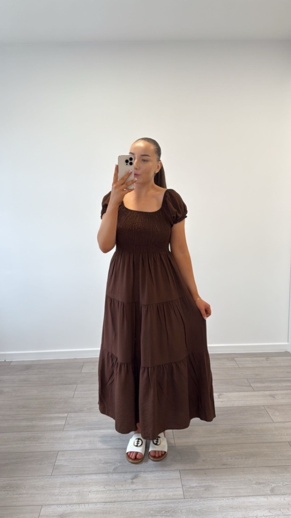 Lekka zwiewna delikatna - tak możemy powiedzieć o naszej sukience Flora w kolorze czekoladowym. Jej krój sprawia że wykorzystasz ją na co dzień oraz na wyjątkowe wyjscia. Dekolt z wszytą gumką - możliwość noszenia sukienki klasycznie lub jako hiszpanka. Biust wykonany z gumonici sprawia że sukienka idealnie dopasowuje sie do każdego rozmiaru biustu.
