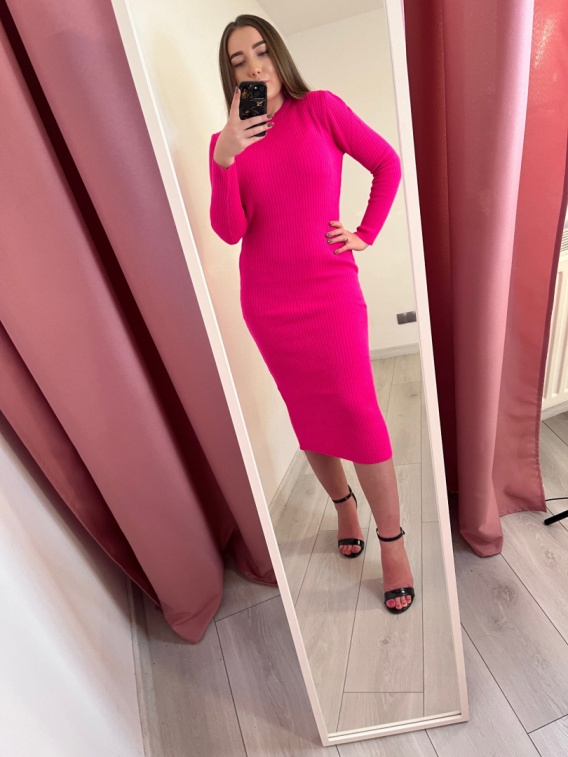 Dzianinowa sukienka basic z długim rękawem i półokrągłum dekoltem. Dopasowany lekko taliowany krój dokonale podkreśla kształty sylwetki, Wykonana z elastycznej prążkowanej dzianiny o długości midi