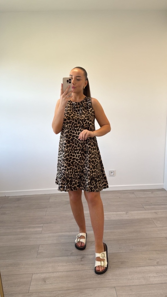 Sukienka midi w panterkę z wiązaniem z tyłu. Uszyta z lekkiego przyjemnego materiału , Dół sukienki zakończony jest delikatną falbanką , a szerokie ramiączka zapewnią komfort noszenia.